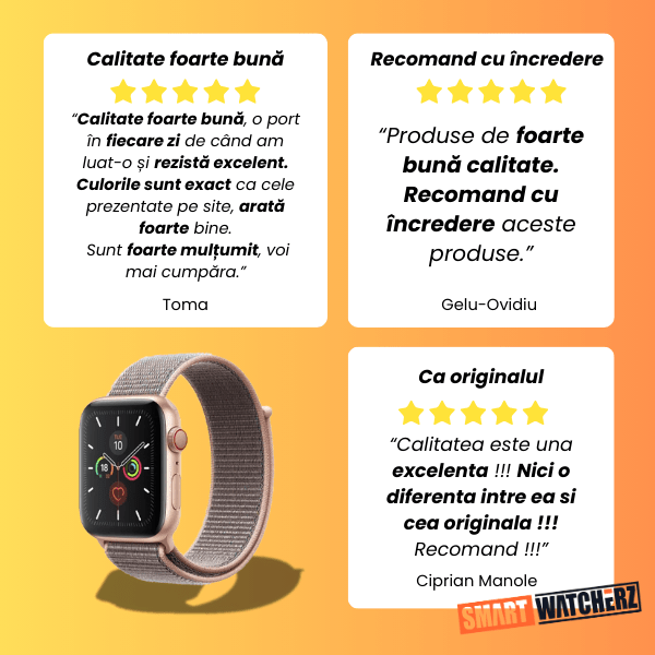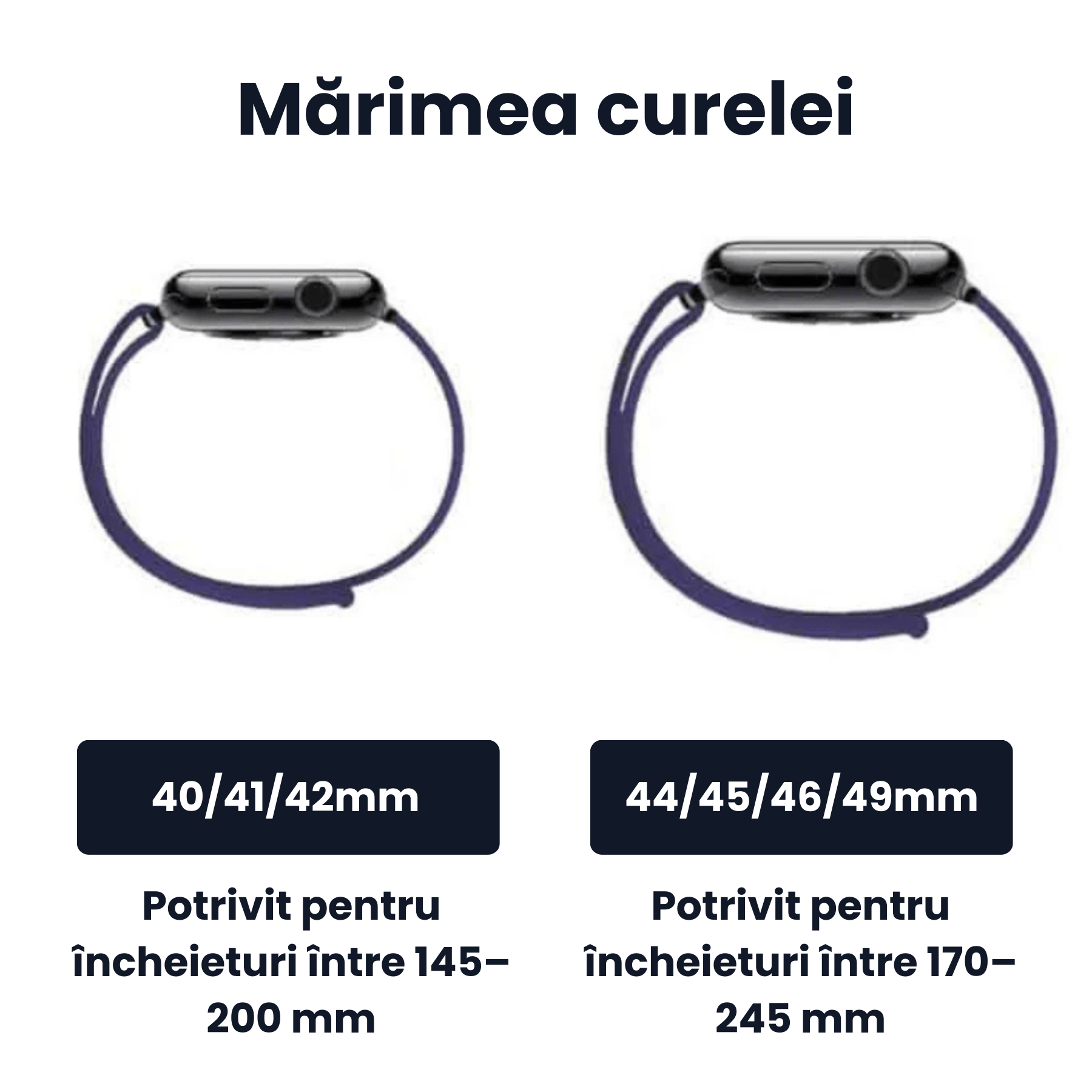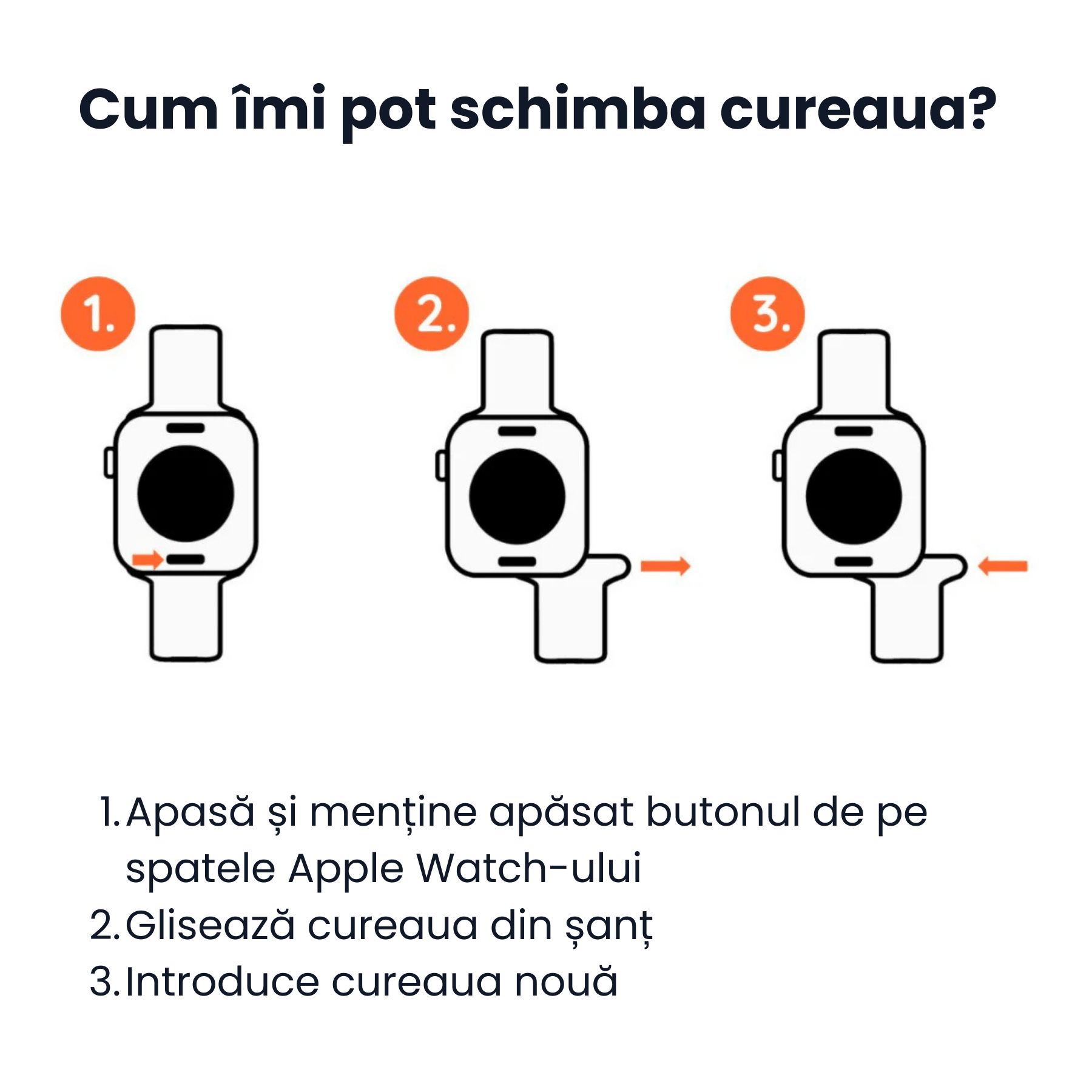 Poți verifica mărimea Apple Watch-ului pe spatele carcasei (ex. 38/40/41 mm sau 42/44/45/49 mm). Pe site-ul nostru, indicăm lângă fiecare curea ce mărime i se potrivește.